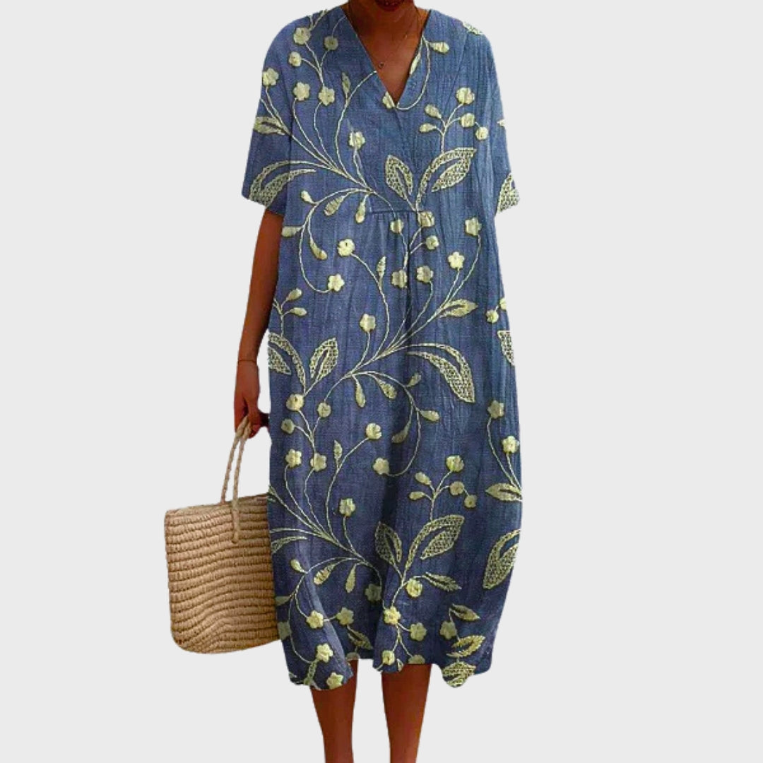 O Vestido Florença combina simplicidade graciosa com um charme clássico e delicado. Com um padrão floral vintage sobre um fundo azul profundo, transmite serenidade e sofisticação. O corte fluido, o decote em V e as mangas curtas tornam-no ideal para dias de sol cheios de leveza e estilo.